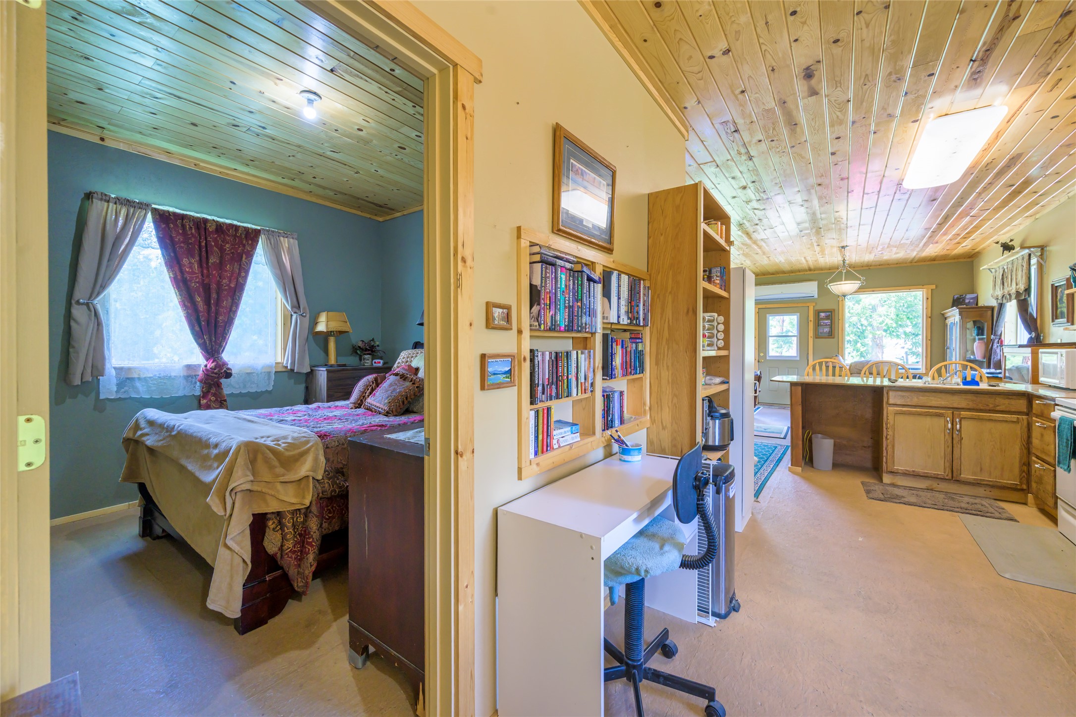 The main home is thoughtfully designed for comfort and flexibility, featuring one bedroom, 1.5 baths, and an additional room currently used as an office that could easily function as a second bedroom or guest space. Large windows bring in the surrounding beauty, and the back porch offers a front-row seat to hummingbird visits, deer sightings, and views of the river and mature landscape.
