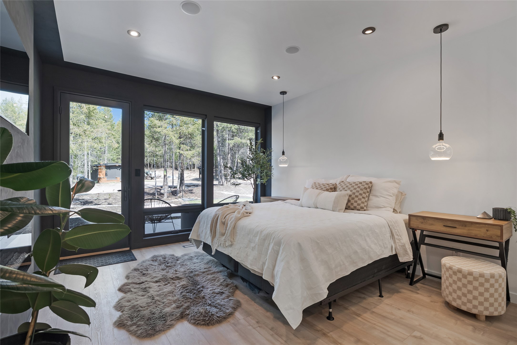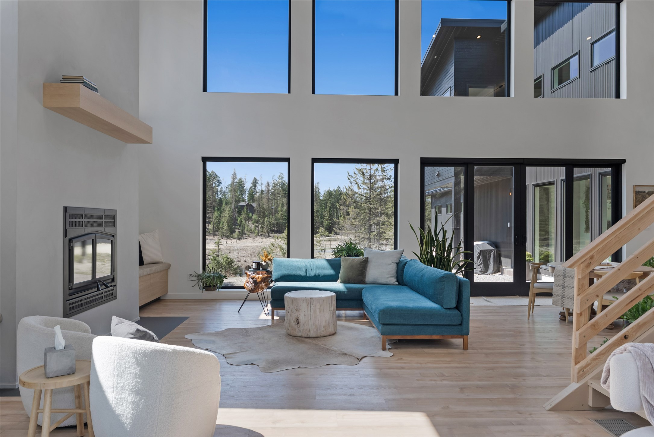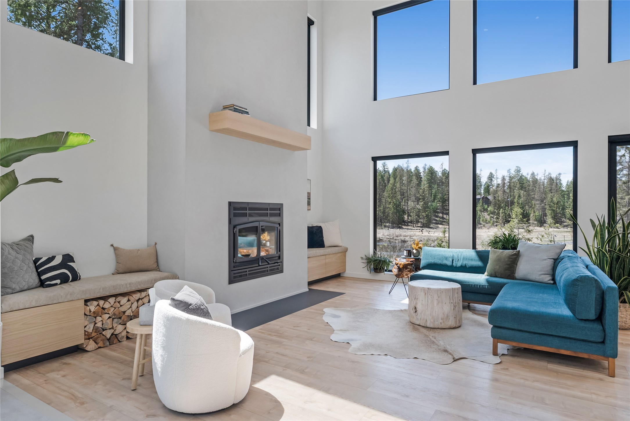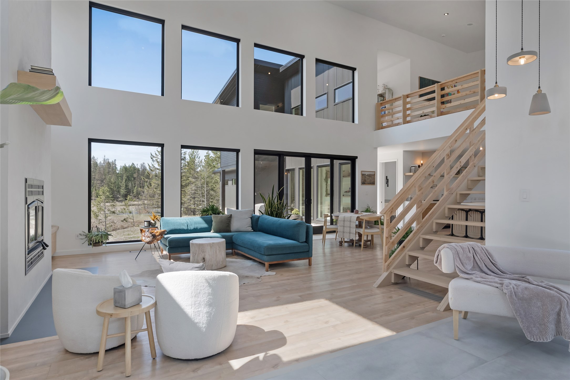 The home itself spans over 3,600 square feet and is a masterclass in modern-rustic design. Inside, you'll find 4 spacious bedrooms, 3.5 baths, and two distinct living areas--perfect for families, guests, or anyone who enjoys both gathering and retreat. A wood-burning fireplace provides a cozy centerpiece in the main living room, while 44 windows throughout flood the space with natural light. Nine-foot ceilings and clean, open lines invite both calm and connection, allowing you to move easily from one area of the home to another.