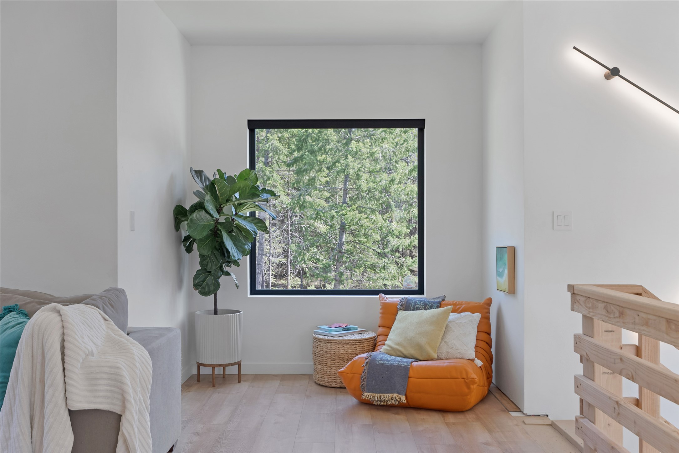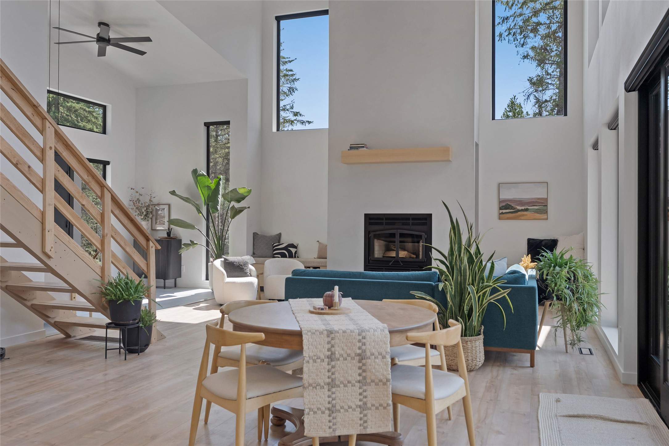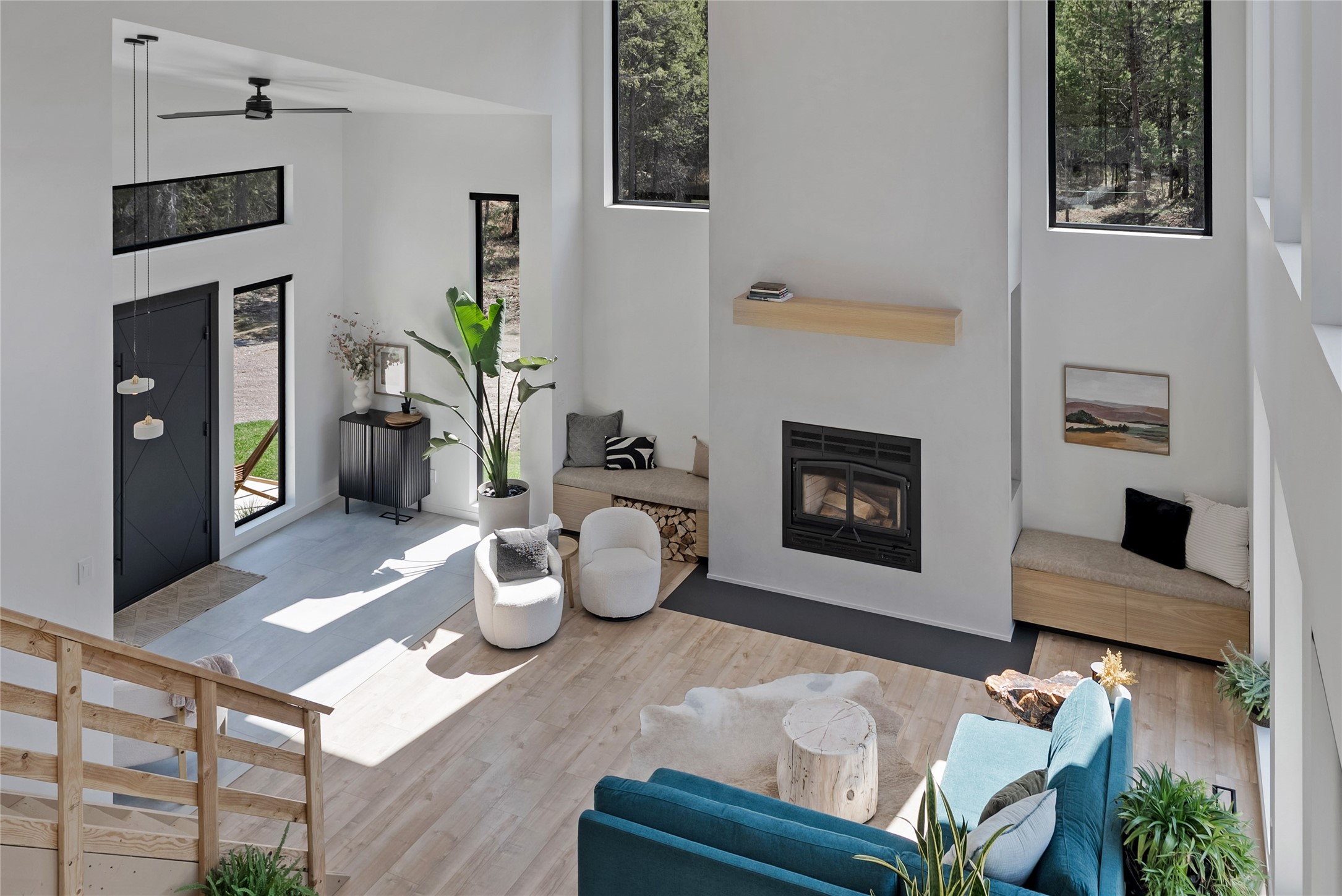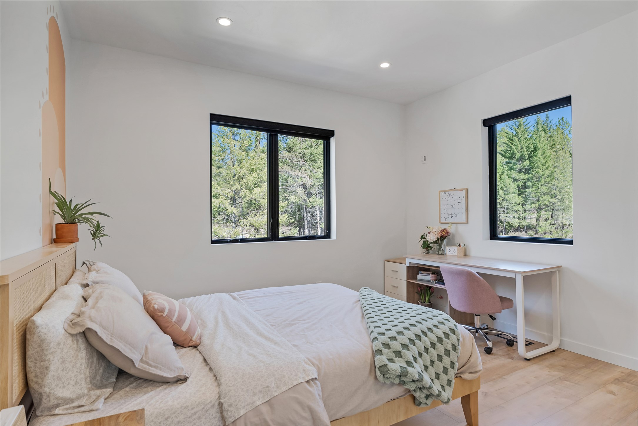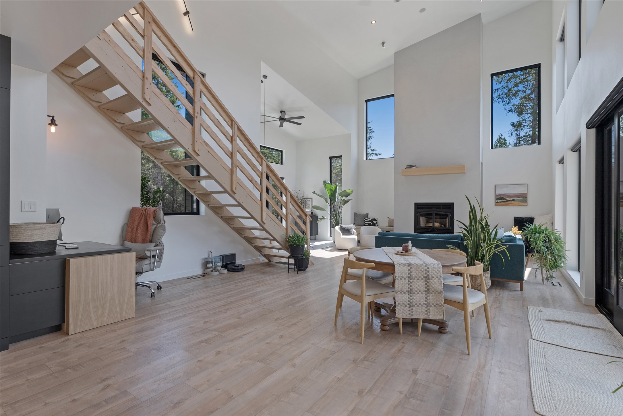 The home itself spans over 3,600 square feet and is a masterclass in modern-rustic design. Inside, you'll find 4 spacious bedrooms, 3.5 baths, and two distinct living areas--perfect for families, guests, or anyone who enjoys both gathering and retreat. A wood-burning fireplace provides a cozy centerpiece in the main living room, while 44 windows throughout flood the space with natural light. Nine-foot ceilings and clean, open lines invite both calm and connection, allowing you to move easily from one area of the home to another.