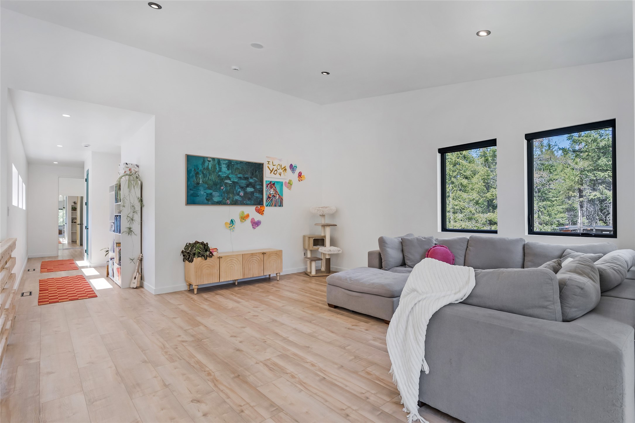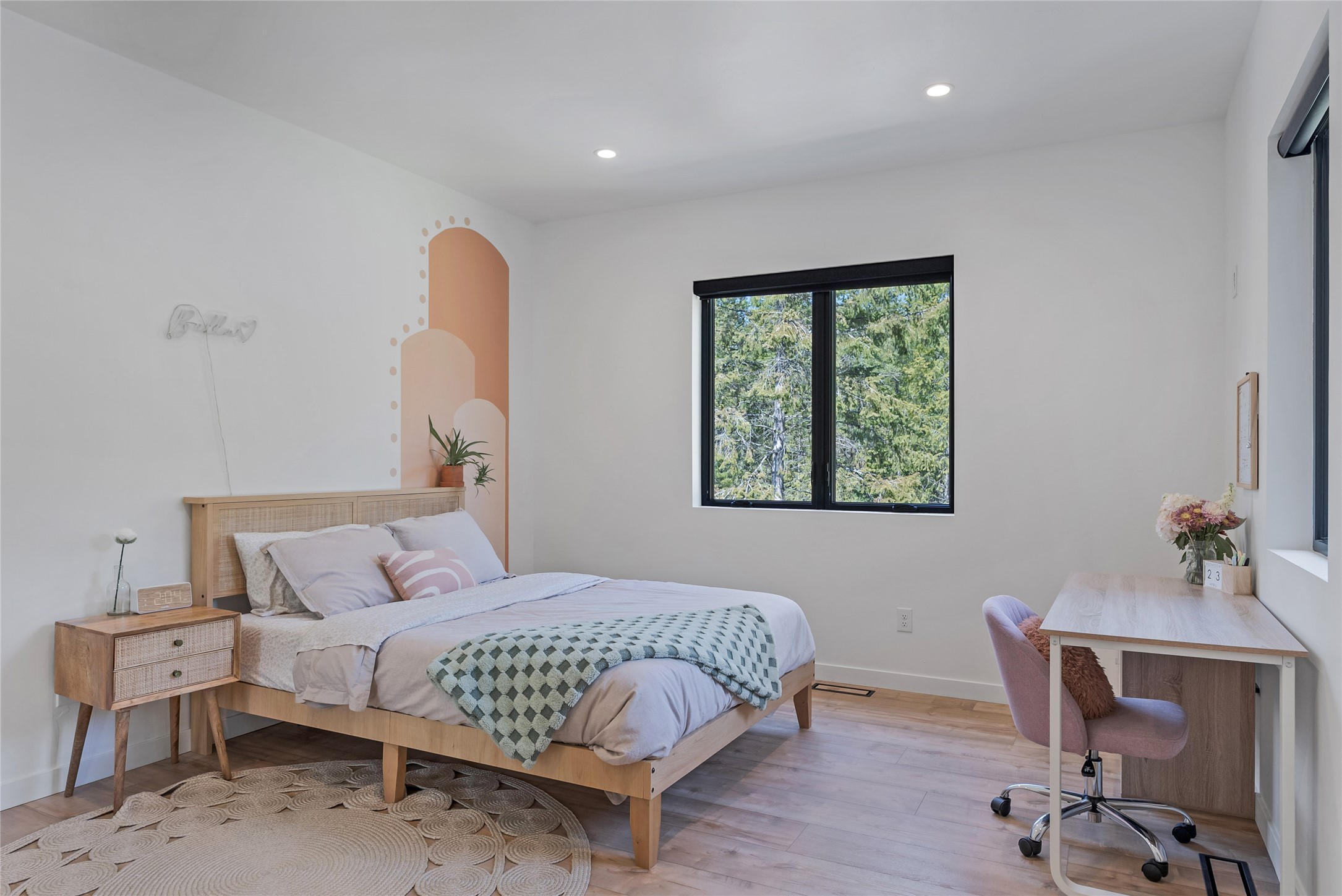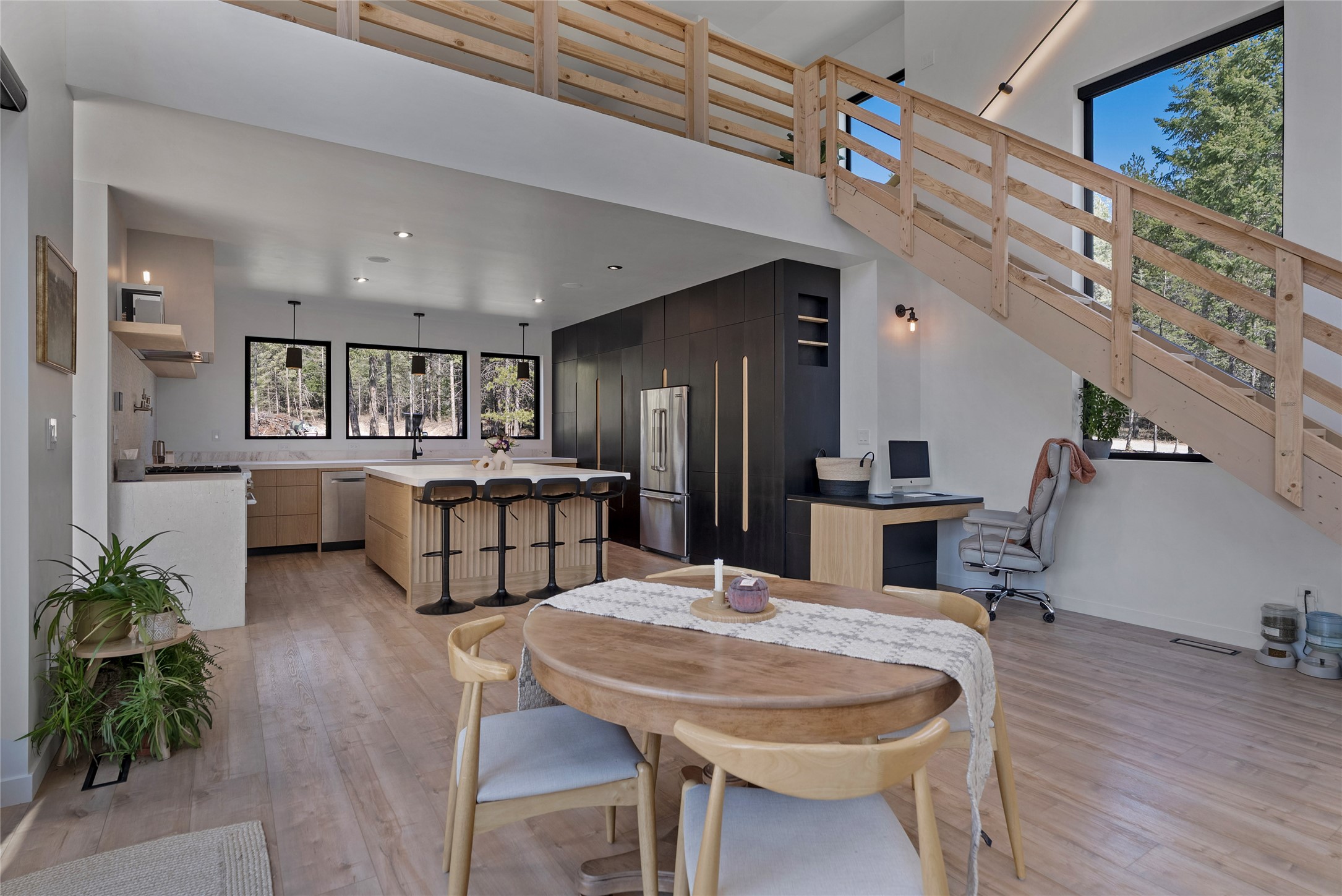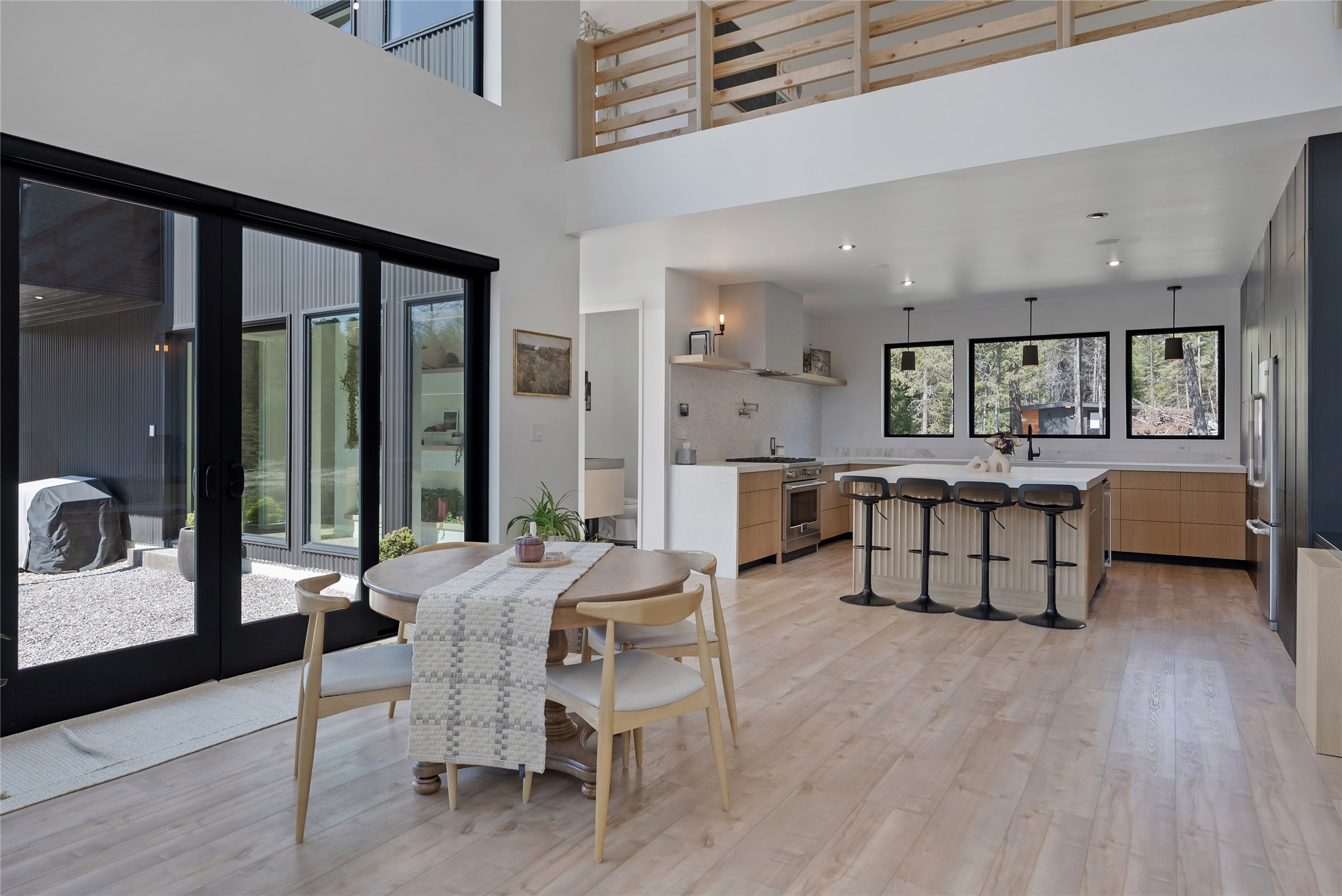The home itself spans over 3,600 square feet and is a masterclass in modern-rustic design. Inside, you'll find 4 spacious bedrooms, 3.5 baths, and two distinct living areas--perfect for families, guests, or anyone who enjoys both gathering and retreat. A wood-burning fireplace provides a cozy centerpiece in the main living room, while 44 windows throughout flood the space with natural light. Nine-foot ceilings and clean, open lines invite both calm and connection, allowing you to move easily from one area of the home to another.