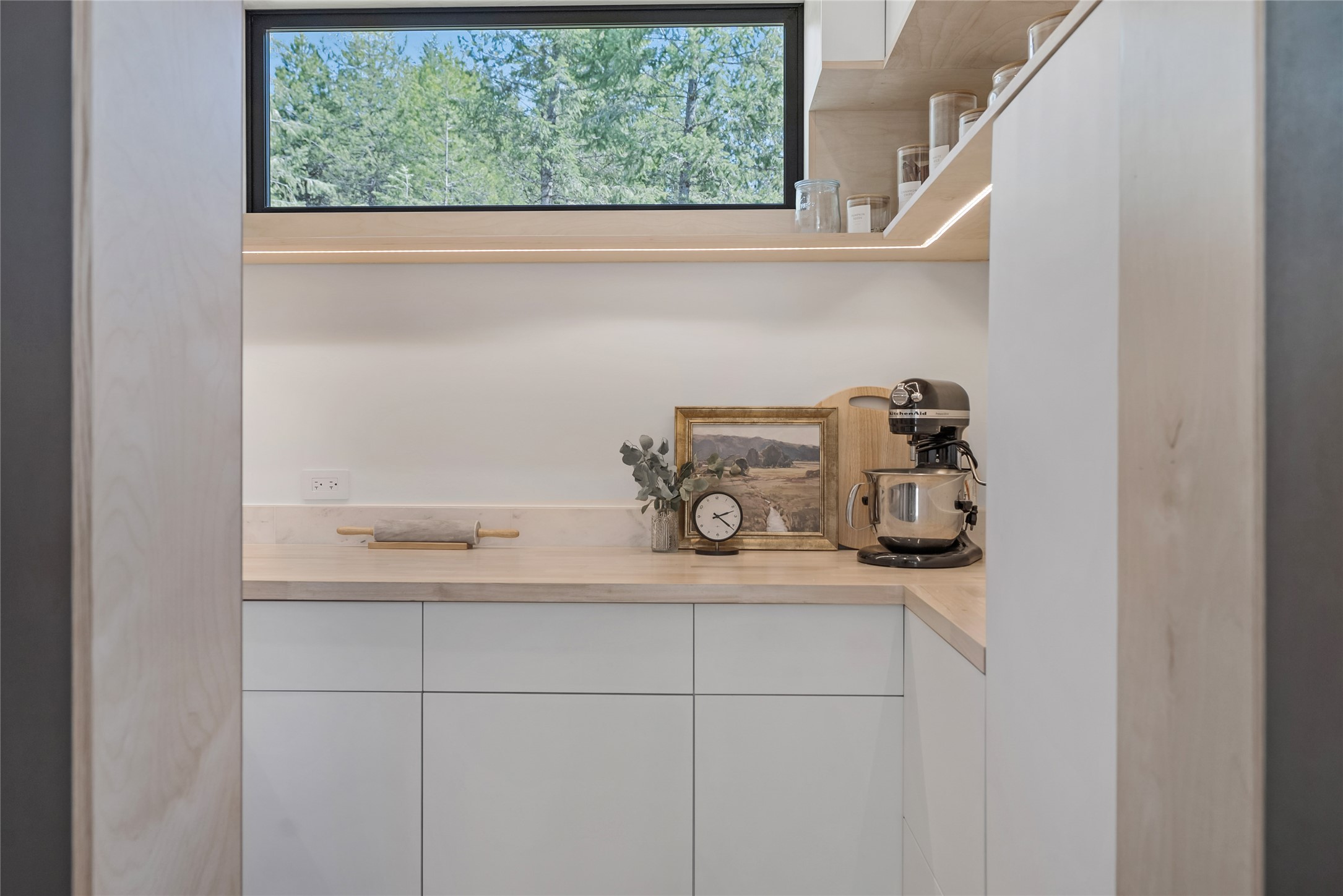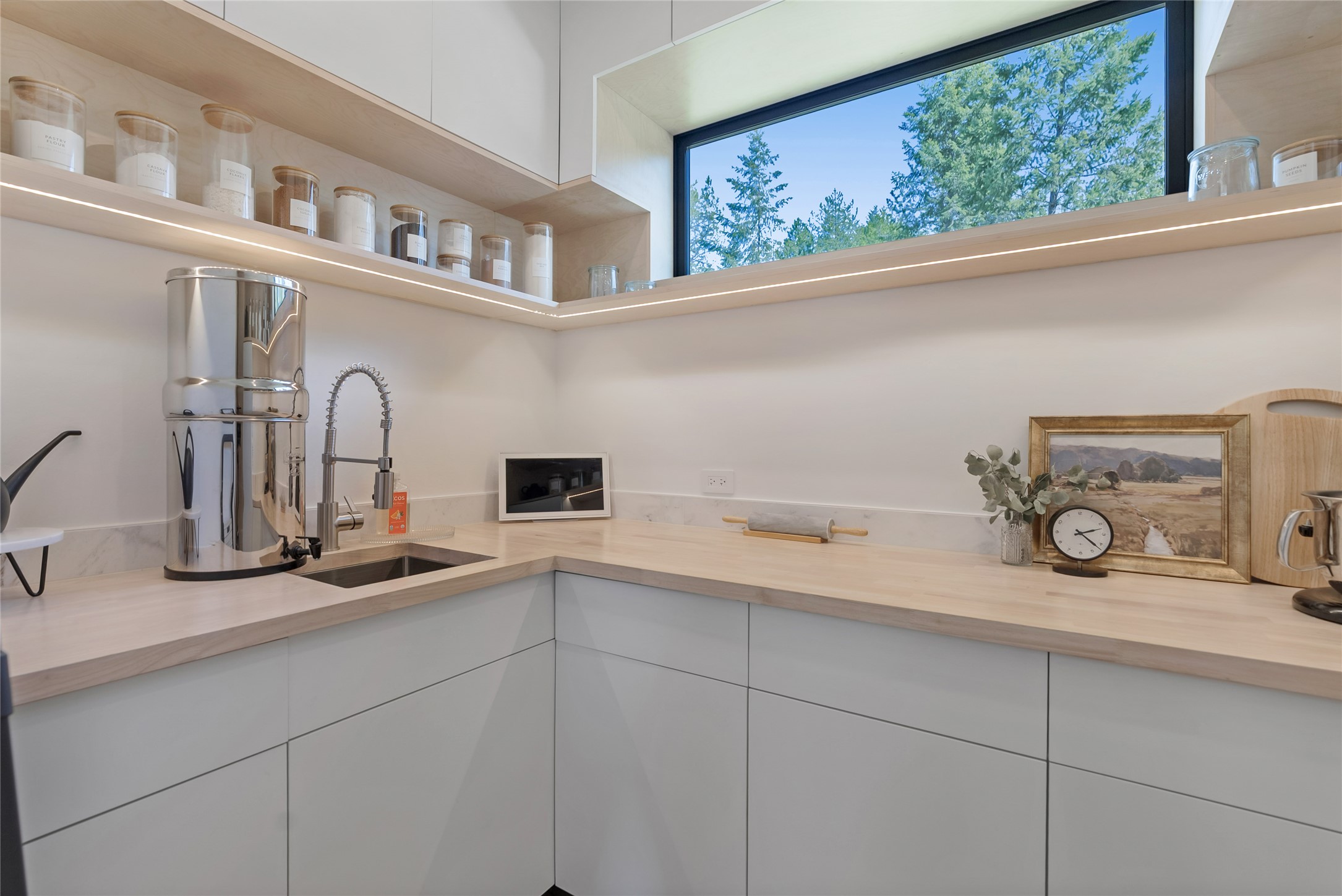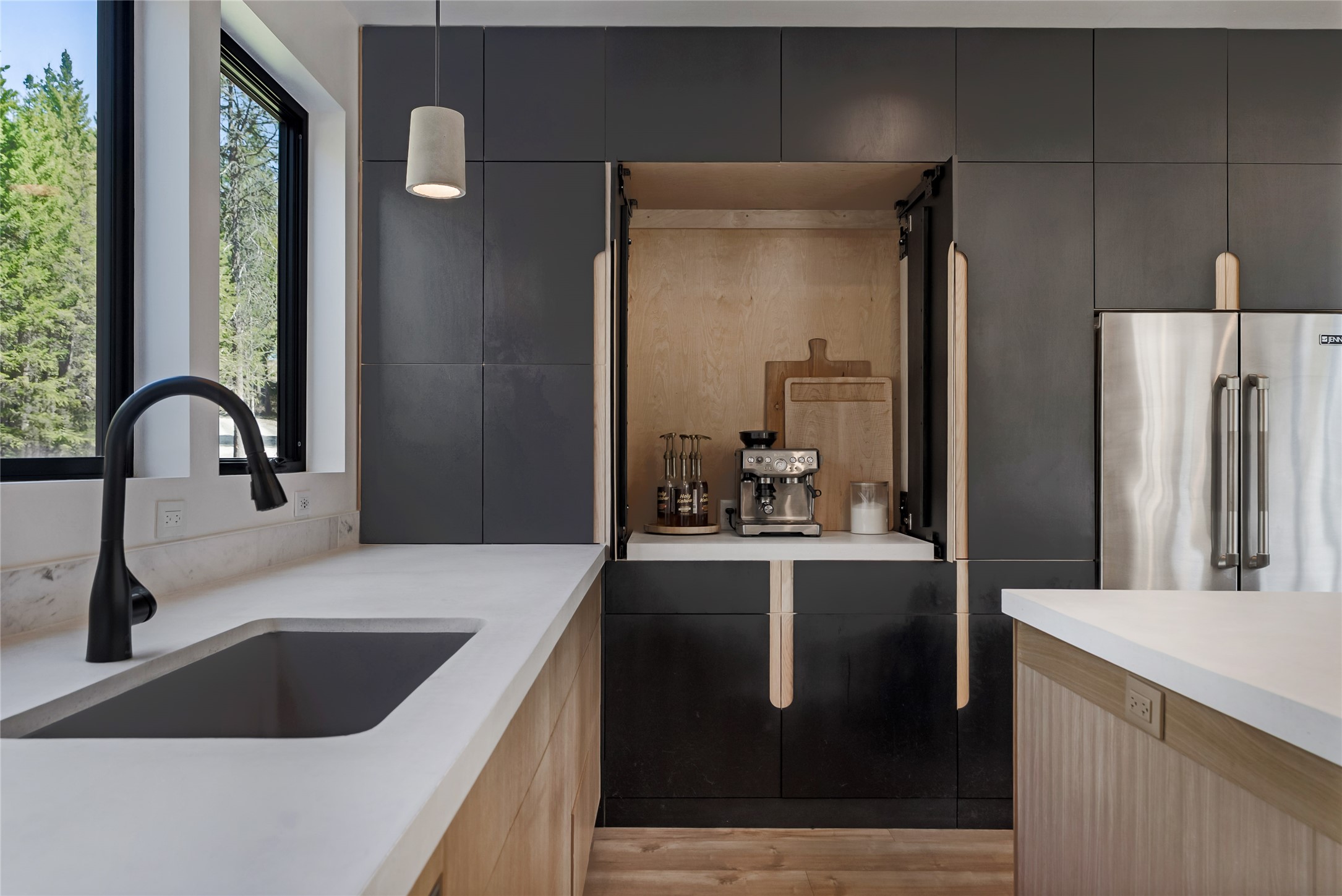 The kitchen is a true showpiece--designed with both beauty and functionality in mind. Custom cabinetry, waterfall concrete countertops, a hidden coffee bar, and a full butler's pantry with a second sink create an ideal workspace for those who love to cook, entertain, or simply live with ease. Every detail is considered, from the layout to the materials, with an emphasis on clean, purposeful design.