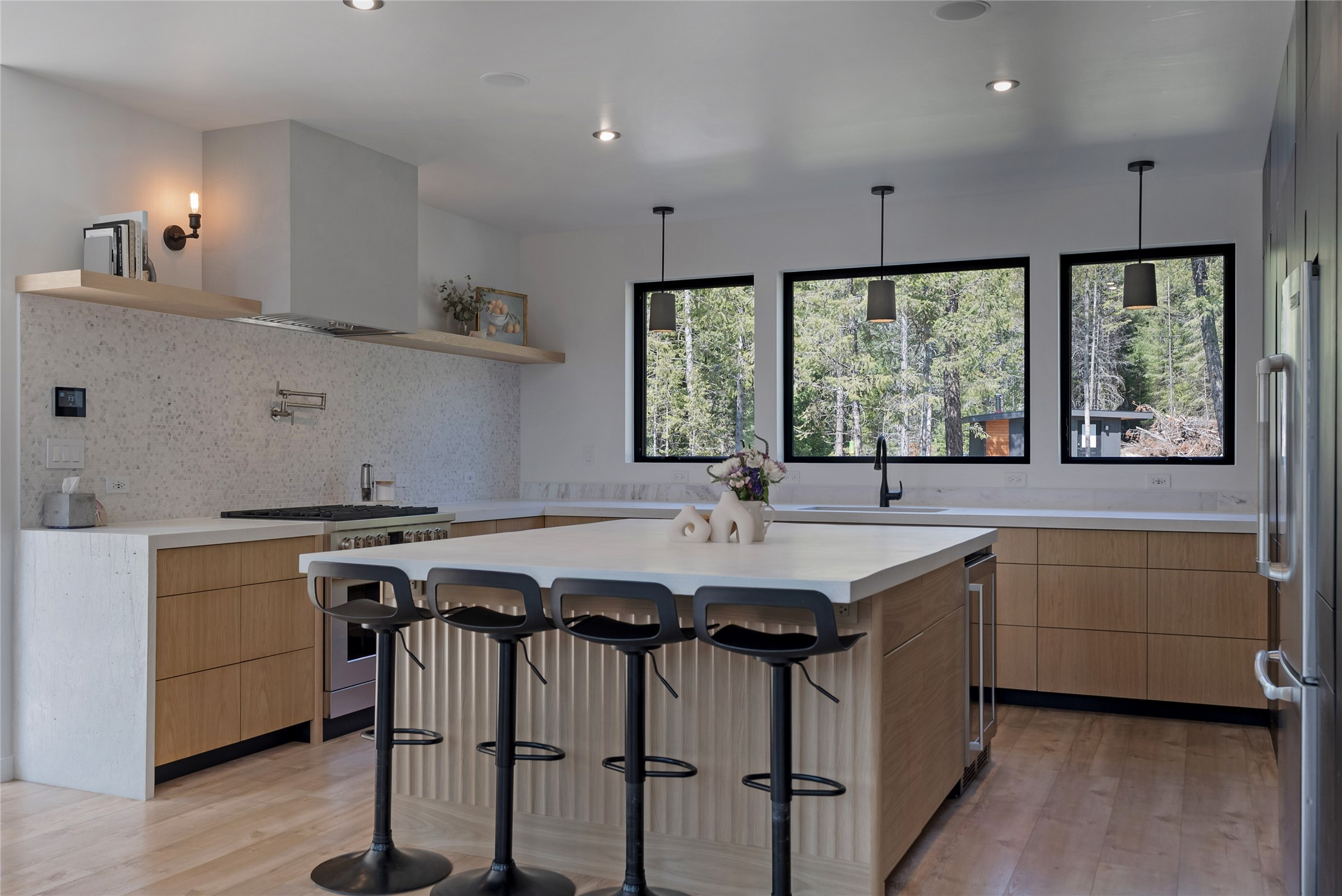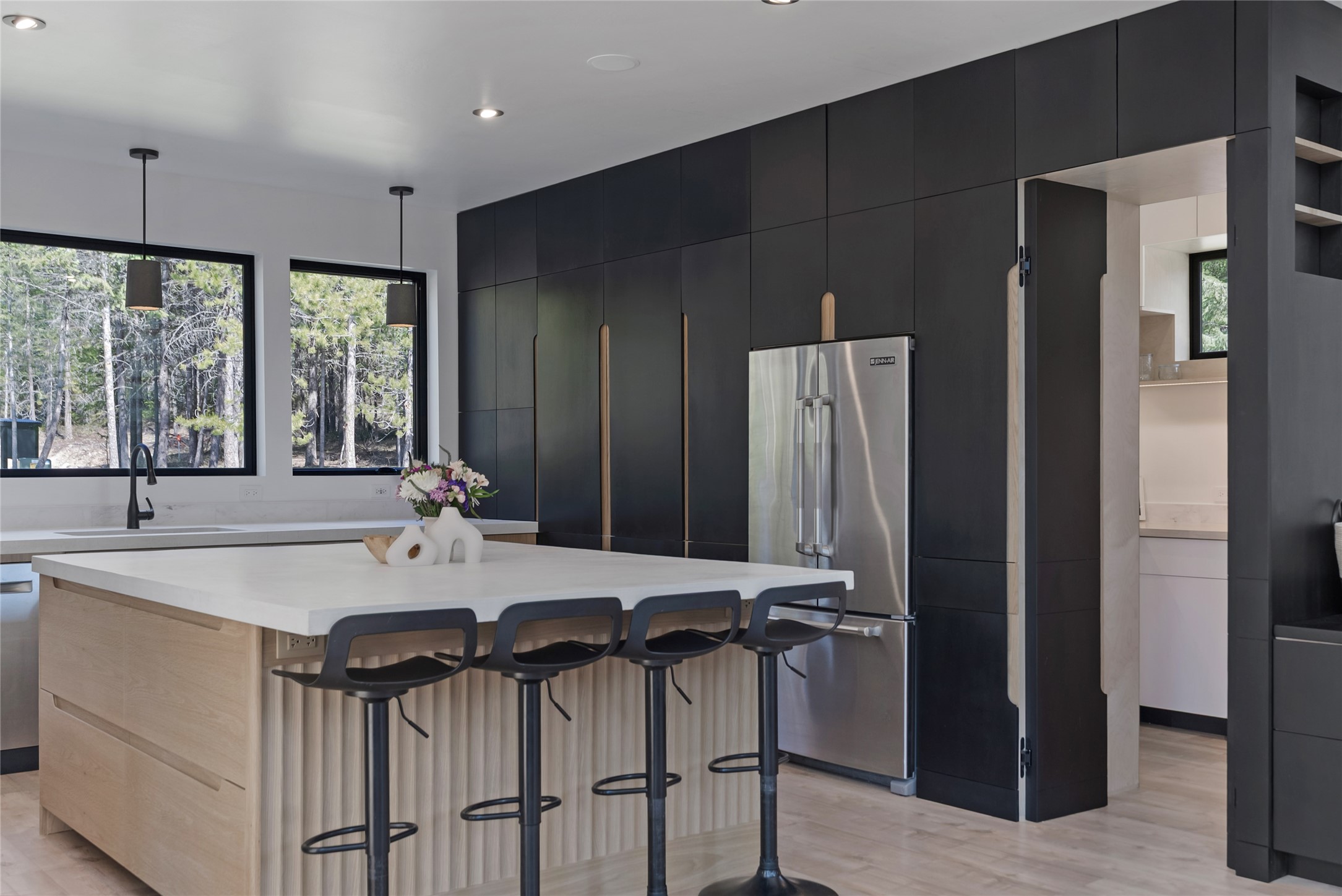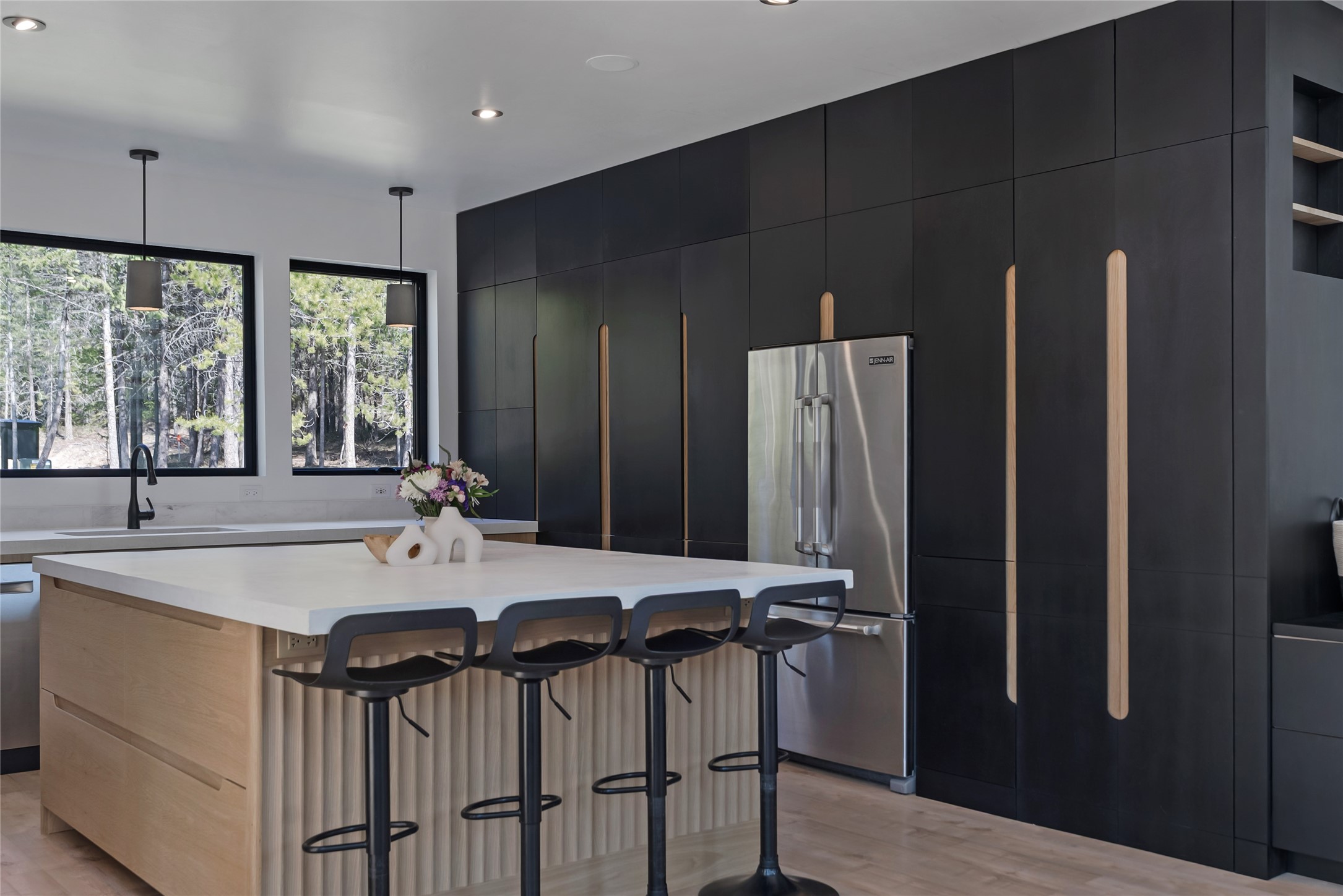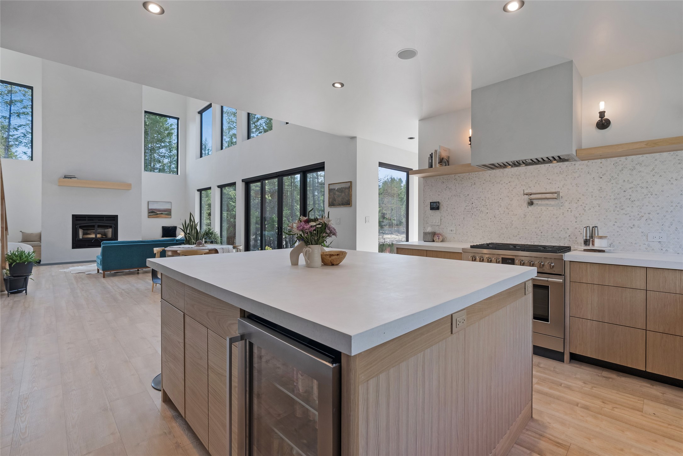 The kitchen is a true showpiece--designed with both beauty and functionality in mind. Custom cabinetry, waterfall concrete countertops, a hidden coffee bar, and a full butler's pantry with a second sink create an ideal workspace for those who love to cook, entertain, or simply live with ease. Every detail is considered, from the layout to the materials, with an emphasis on clean, purposeful design.