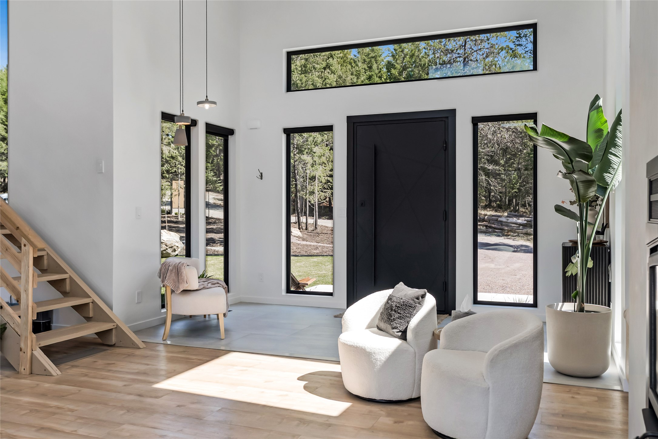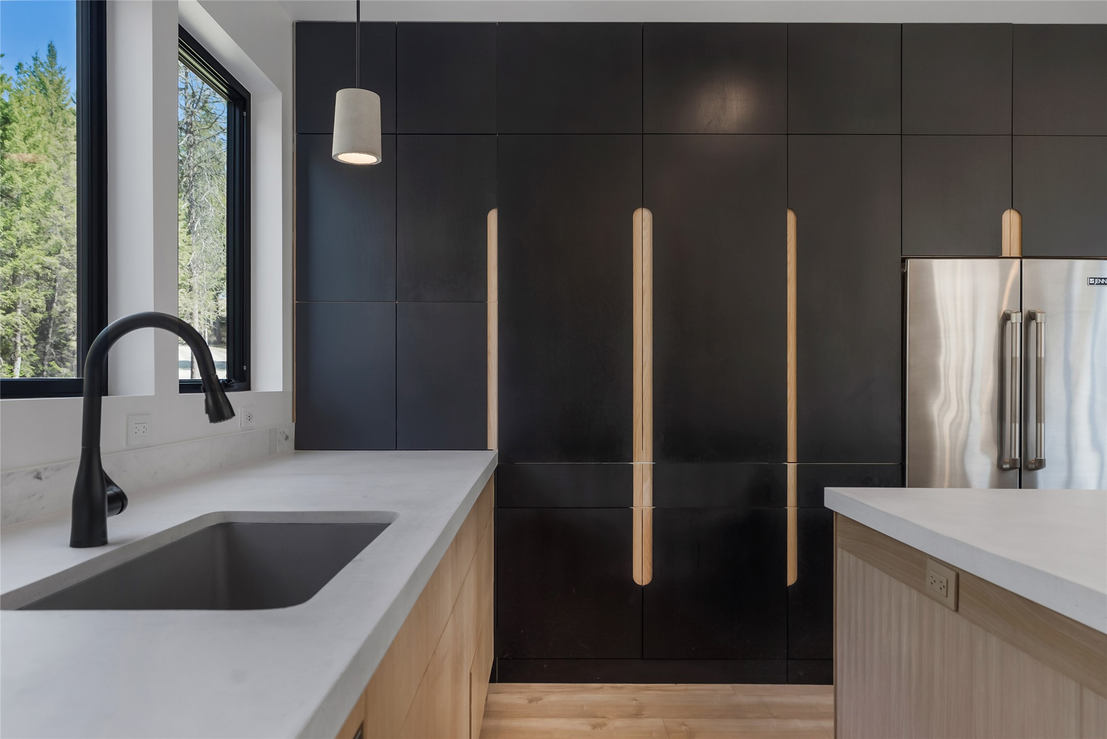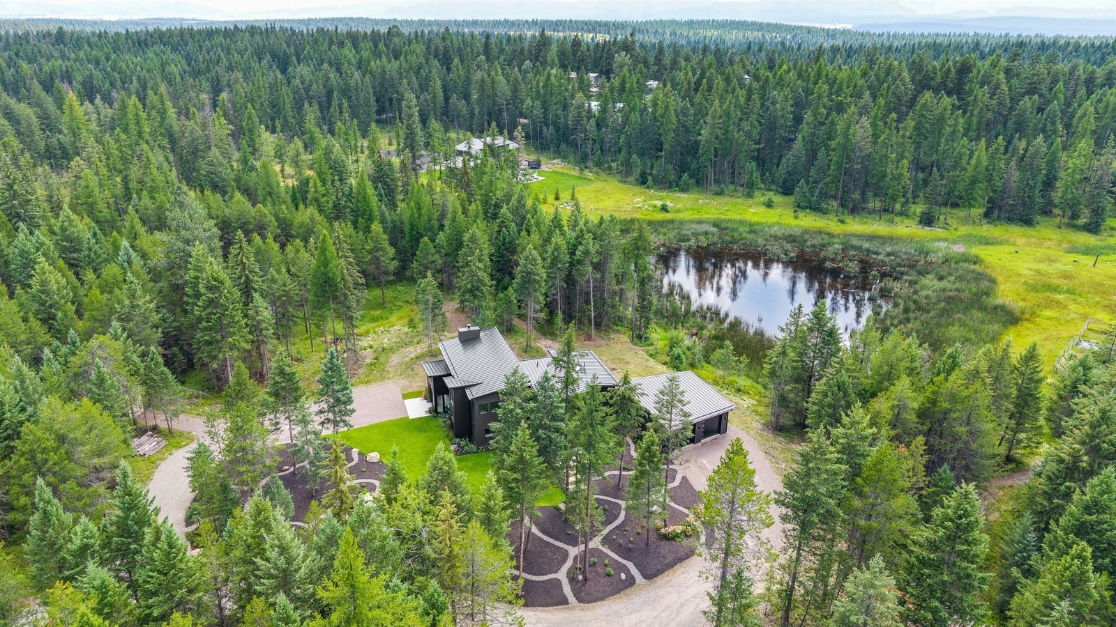 Tucked away on over 10 acres, this new mountain-modern home blends privacy, serenity, and thoughtful design--just minutes from town. Native pines, tamaracks, and organic trails surround a private pond, inviting a slower pace of living. With 3,600+ sq ft, the home features 4 bedrooms, 3.5 baths, two living areas, and a wood-burning fireplace. 44 windows and 9' ceilings create bright, open spaces that bring the outdoors in. The kitchen centers the home with custom cabinetry, waterfall concrete counters, a hidden coffee bar, and a butler's pantry with a second sink for convenience. The primary suite offers outdoor access, a Roman clay fireplace wall, a spa-like bath with heated floors, a deep soaking tub, and a rainfall shower. Beyond the home, enjoy the fenced garden, gather around the fire pit at dusk, or take in the peace of your surroundings. Infrastructure is in place for a future guest house or workshop. The Perfect Balance of Modern Living and Wild Montana Beauty