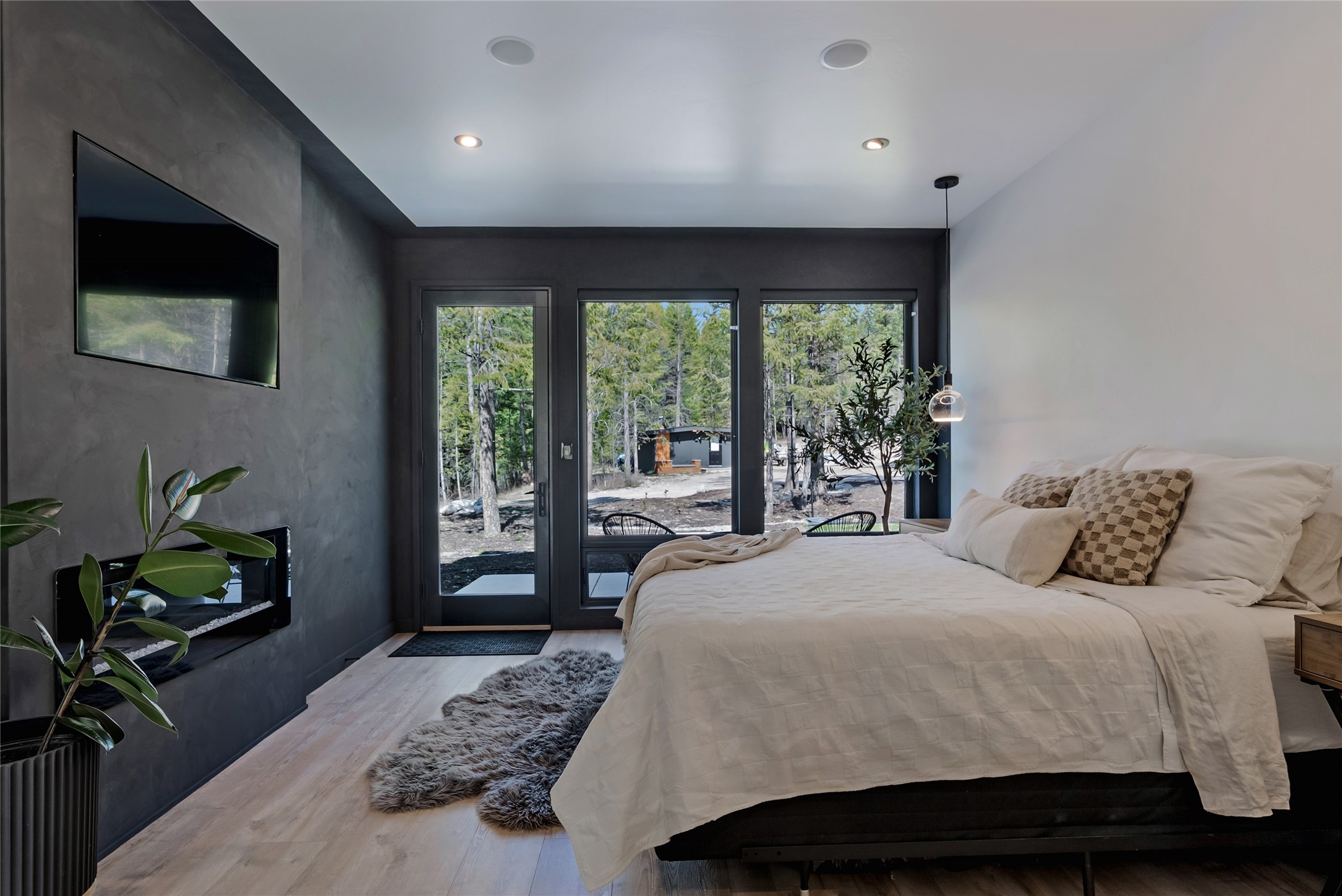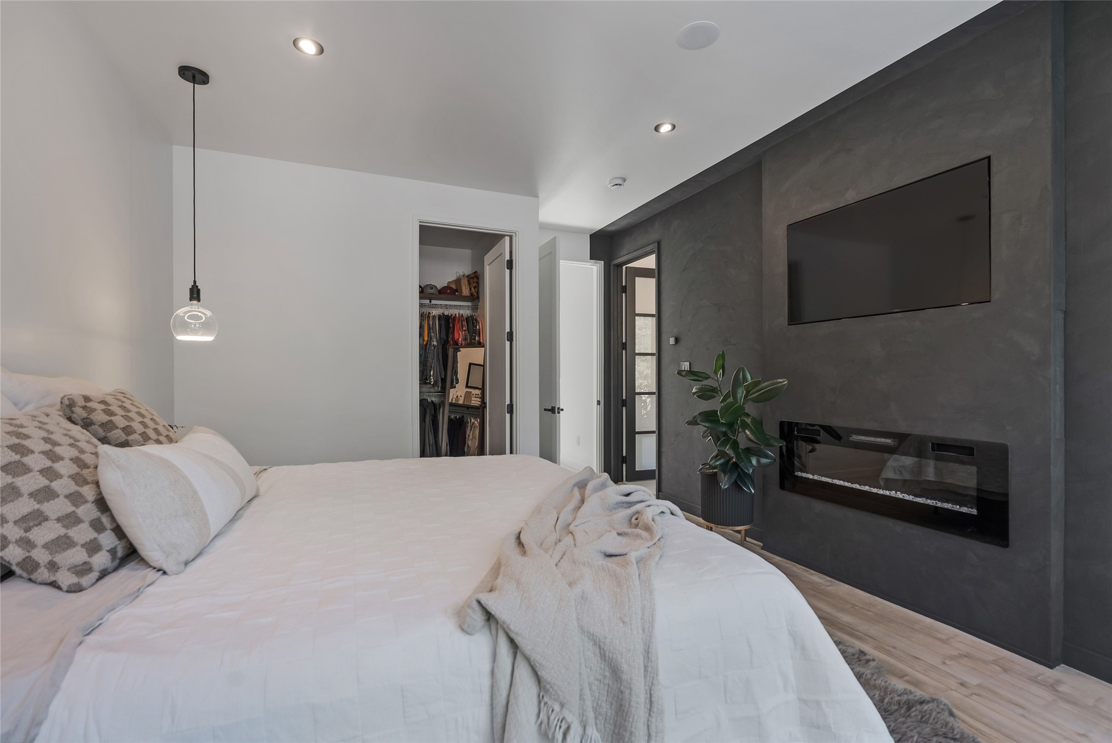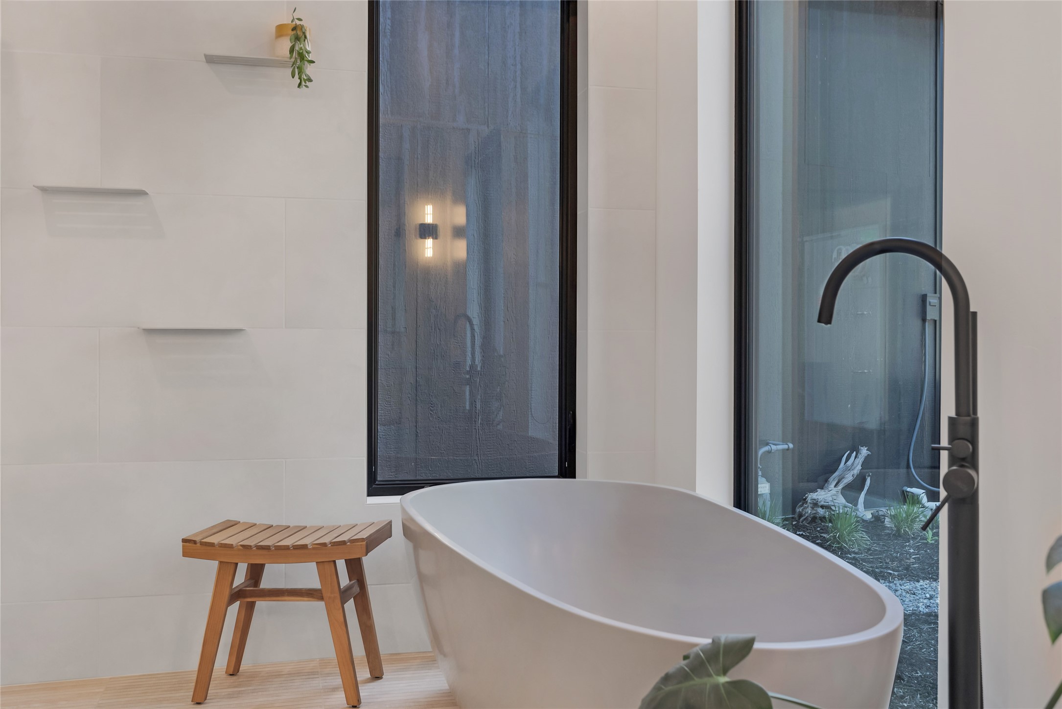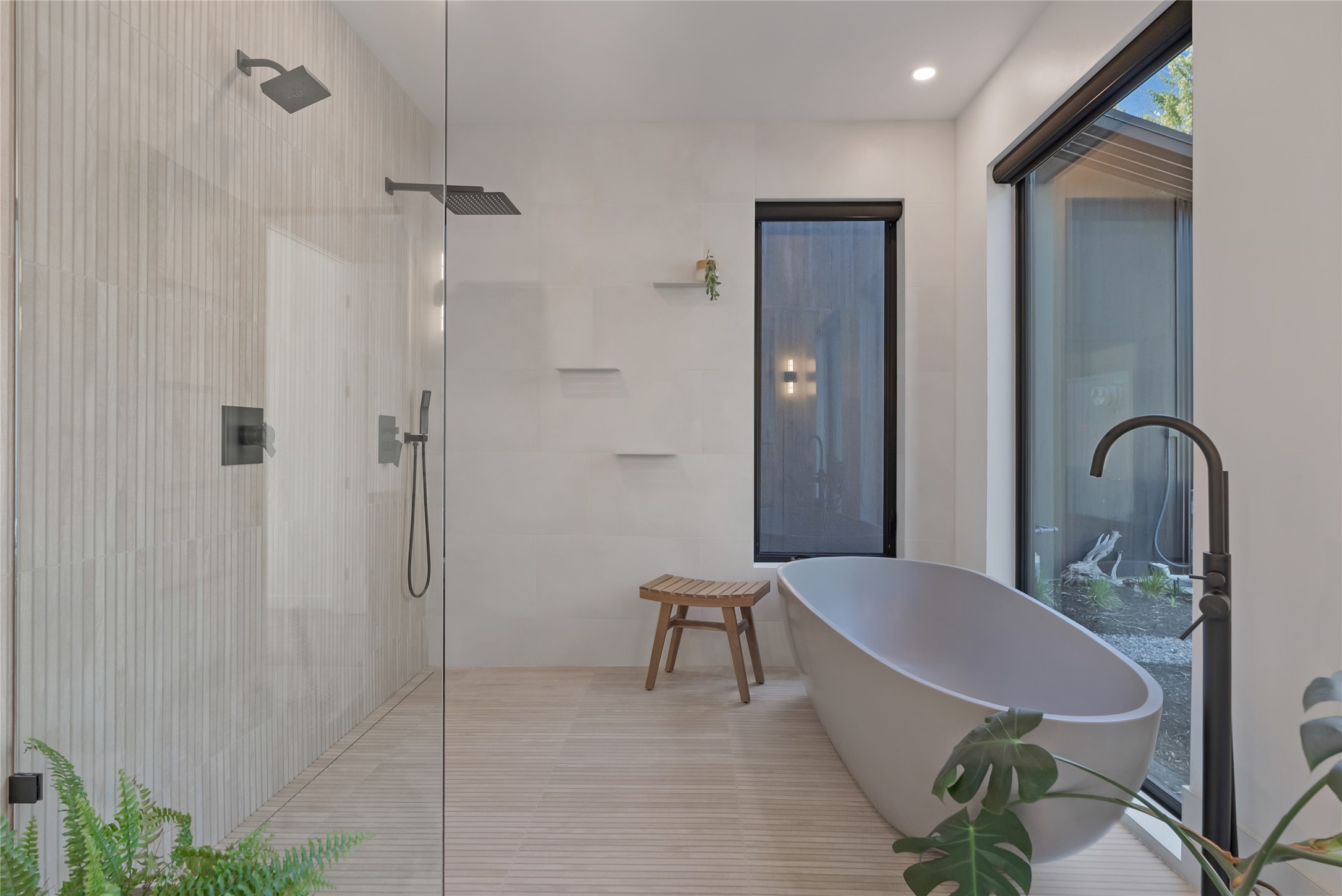 The primary suite is a private retreat within the home. With direct outdoor access and a fireplace wall finished in smooth Roman clay, it feels like a boutique getaway. The ensuite bath is spa-inspired, featuring heated floors, a deep soaking tub, and a rainfall shower--all designed to encourage relaxation at the end of a long day.